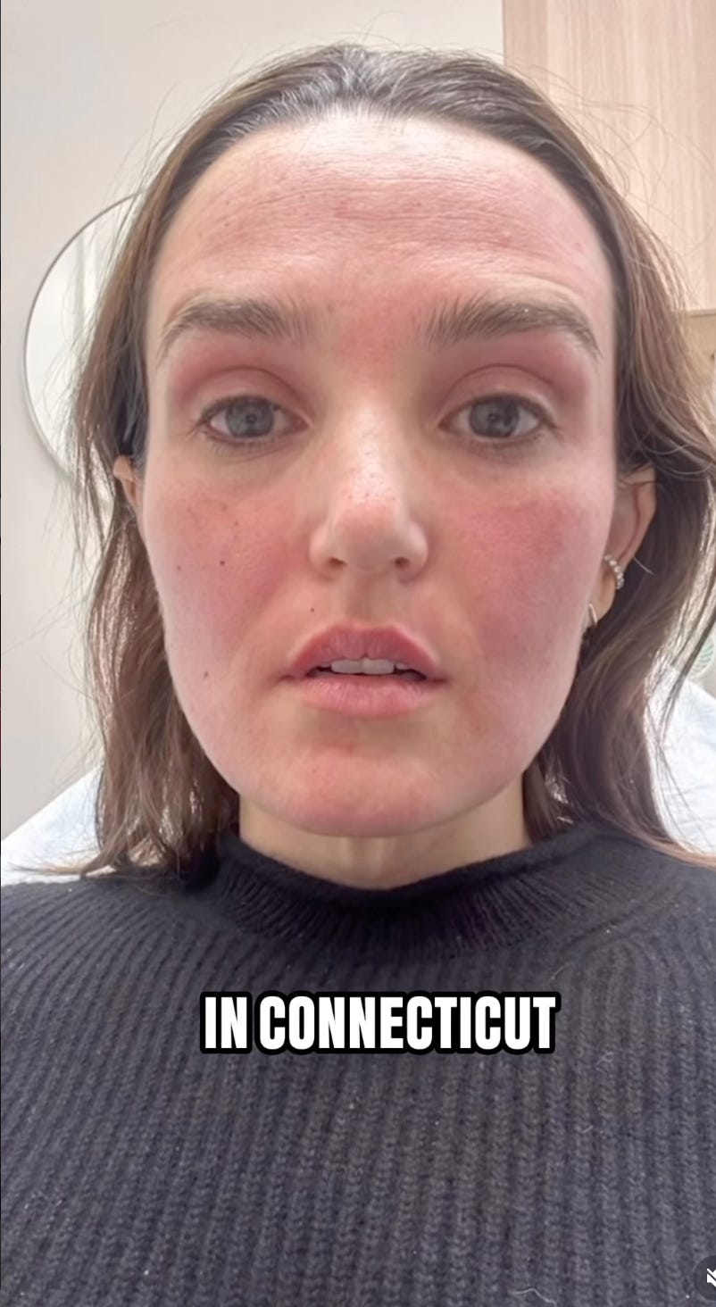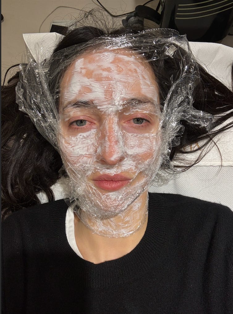 I think I must have watched Chloe Fineman’s botched selfies video about a hundred times. One of the most relatable things I’ve seen in a long time, in it she satirises the culture of women who like bears goc into hiding while recovering from having their face soaked in salmon gravy or their outer layer skin blasted off by carbon monoxide, while sending a series of frenzied selfies to their friends. Which is something i do on the regs. Like Chloe, my phone is absolutely flooded with aggressively close-up and heavily annotated images of my face from a myriad of angles, both pre- and post-treatments. Actually, it’s 3 angles, left, right, and front on - 3 totally different people adhering to 3 totally different standards of beauty, 2 of which i dont really identify with. Unlike Chloe, I’d rather eat wasps than share them on Instagram. I might make an exception for Substack.